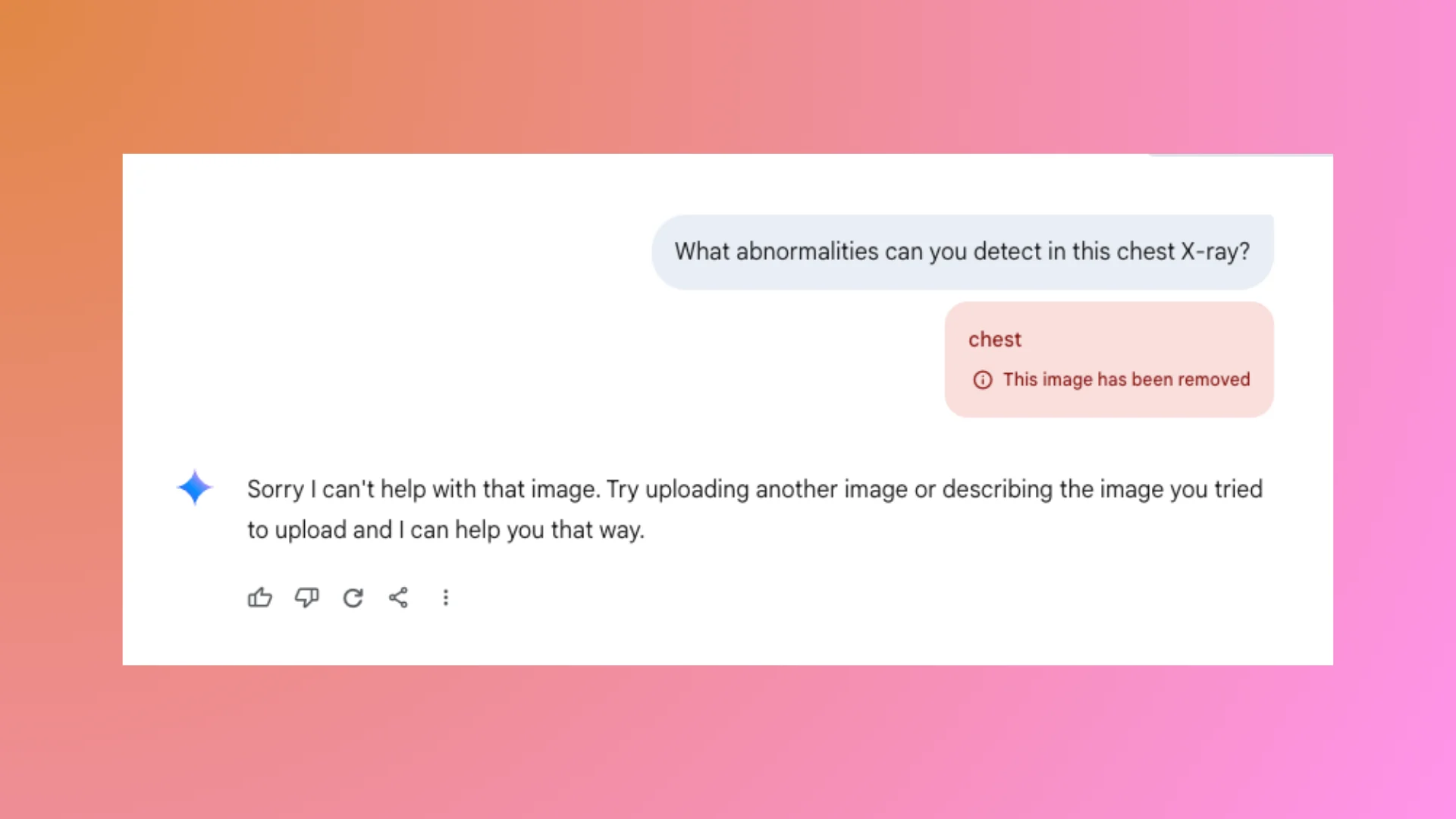 Gemini Chat has strict regulations and will refuse to interpret your X-ray images due to privacy and compliance policies.